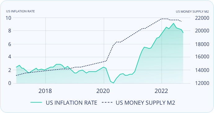 The U.S. economy has experienced surging inflation since mid-2021. Although the cause of this inflation surge has been the subject of heated debate, many factors are thought to contribute to it. The Covid-19 pandemic created enormous demand for consumer staples while grinding supply chains to a halt, driving prices up sharply and creating shortages. At the same time, U.S. monetary policymakers responded with significant increases in the money supply, starting in early 2020. In early 2022 the breakout of a war between Russia and Ukraine created large disruptions in the global markets for wheat and natural gas, among other commodities. The relative strength of the labor market has driven up producer prices, which are also ultimately reflected in inflation figures. All of these factors are often mentioned as contributors to the inflation surge.