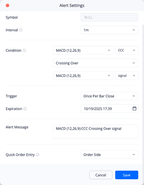 Note: If you modify the script code or parameters of the associated indicator, the existing alert will continue to use the original settings and script to trigger notifications. If you want the alert to reflect the updated indicator configurations, you will need to create a new alert instead of editing the existing one.