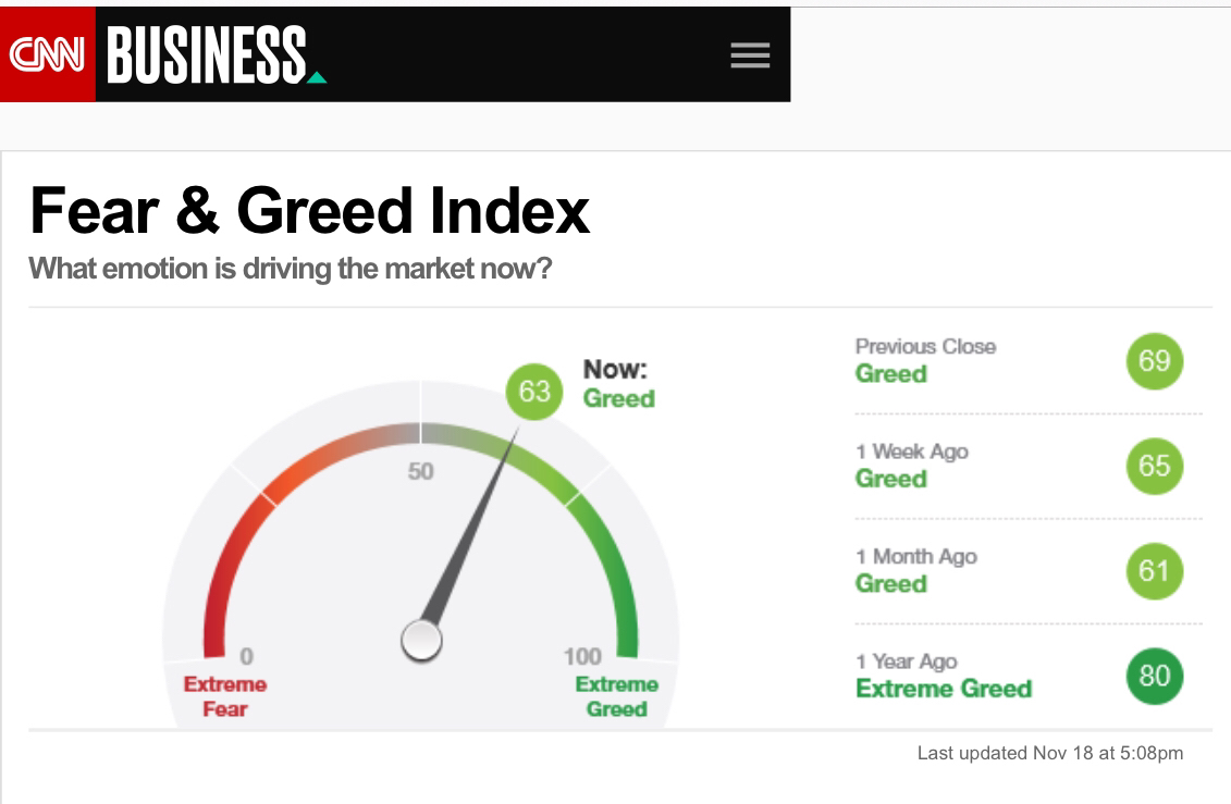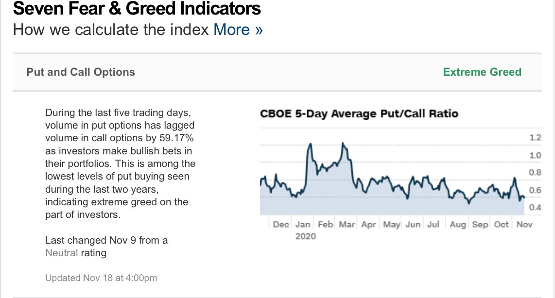 Put and Call Options: Extreme Greed During the last five trading days, volume in put options has lagged volume in call options by 59.17% as investors make bullish bets in their portfolios. This is among the lowest levels of put buying seen during the last two years, indicating extreme greed on the part of investors. Last changed Nov 9 from a Neutral rating Updated Nov 18 at 4:00pm Source CNN business $Tesla Inc $Nio Inc. $ProShares UltraPro Short QQQ $SPDR® S&P 500® ETF $ProShares Ultra VIX Short-Term Futures $ProShares Short VIX Short-Term Futures $ProShares UltraPro QQQ $Apple Inc $Microsoft Corp $Meta Platforms Inc $Amazon Com
