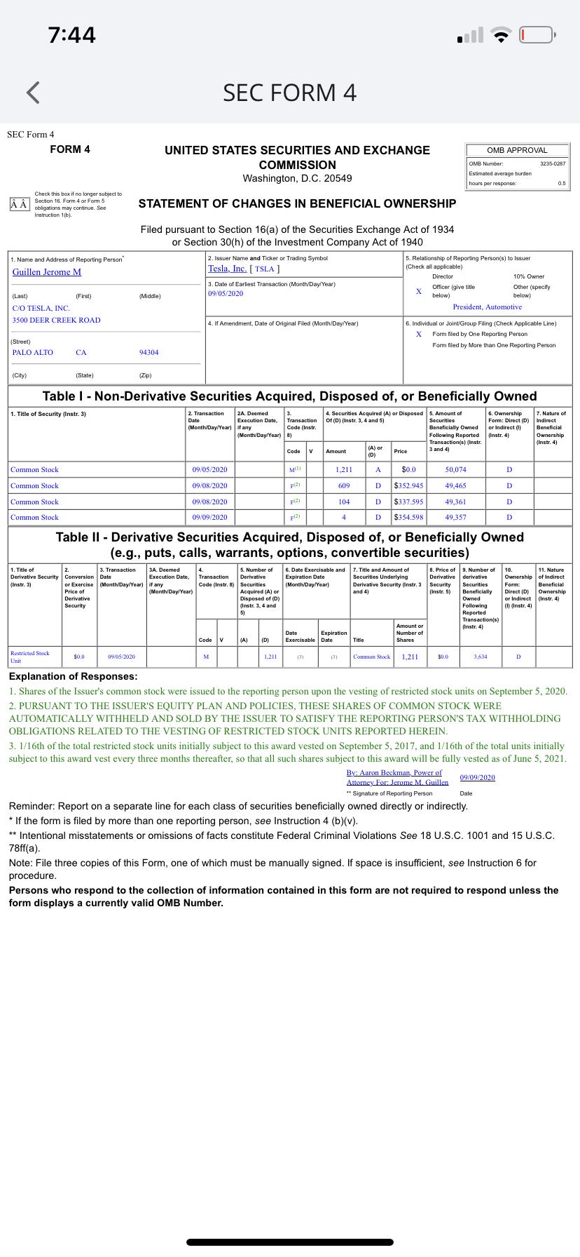 $Tesla Inc if the president sells the week before battery day, 3 days after he aquired the shares AND was even allowed to sell.... what do you think said president is expecting? More institutional sized dumps to come, scare you retail bulls out of your position, then by it back at a “discount”(fair value). Either sell or hold. Buy the rumors, sell the news. your battery day is alreay priced in... to an extremely over valued stock that has virtually no support in the mid term.
